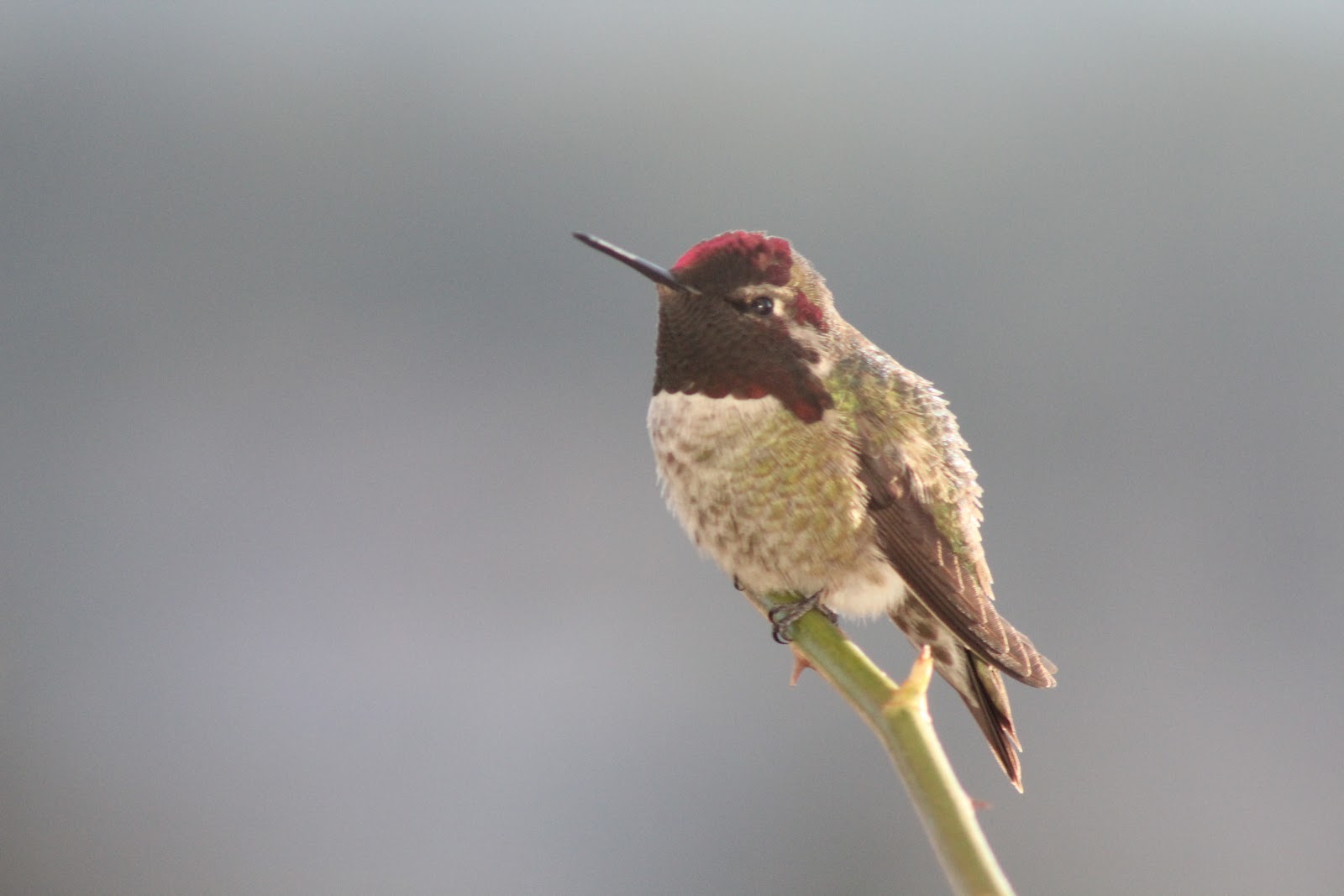 2/14/11 Gil's photo of an Anna's Hummingbird (Calypte anna) perched on a stem of the China Rose, Rosa mutabilis.